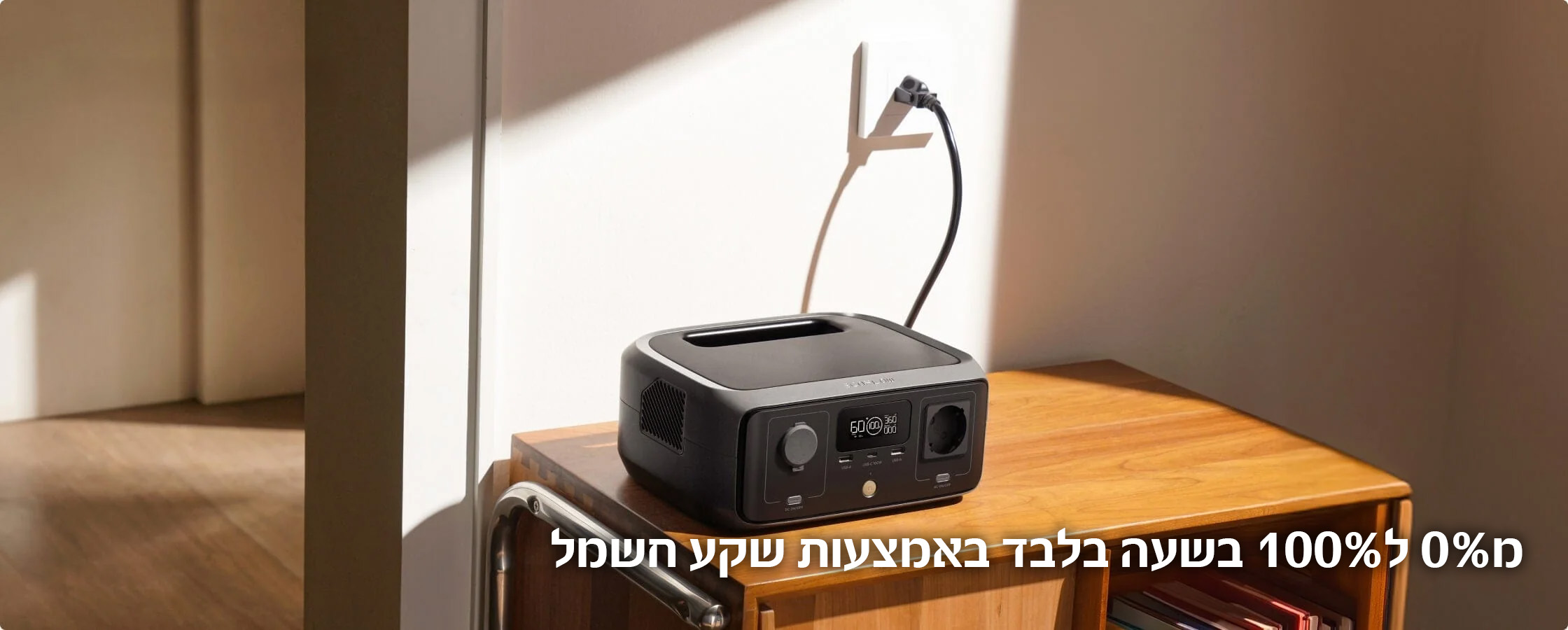 נטען גם עם פאנל סולארי (110W) ב-2.6 שעות, עם פאנל מתקפל (45W) לניידות, ממצבר הרכב בנסיעה, או עם גנרטור לשקט ובטיחות לכל היום.